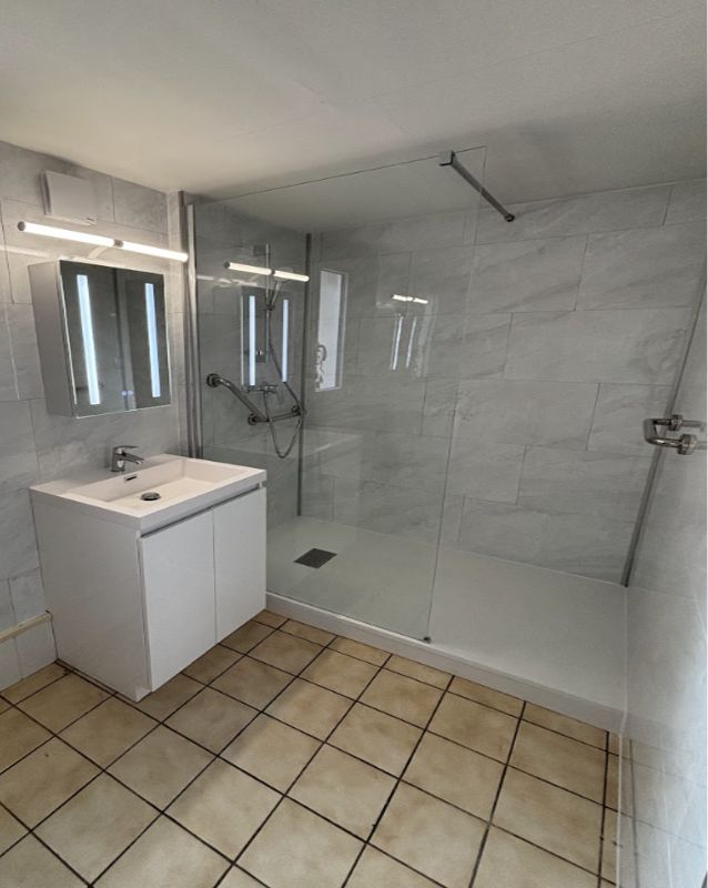 • Douche pratique et contemporaine : Nous avons installé une douche de plain-pied, ou avec un seuil très bas, pour un accès aisé.