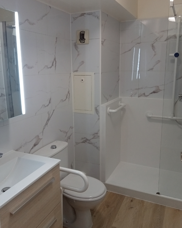 Grâce à cette transformation complète, la salle de bain offre désormais un environnement totalement sécurisé, pensé pour répondre aux besoins d’une personne sénior. L’accès est plus simple, les déplacements sont fluides, et chaque élément a été conçu pour réduire les risques de chute.